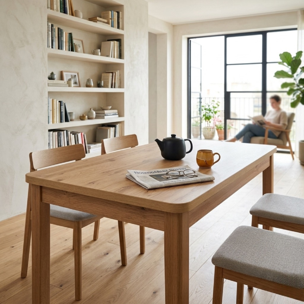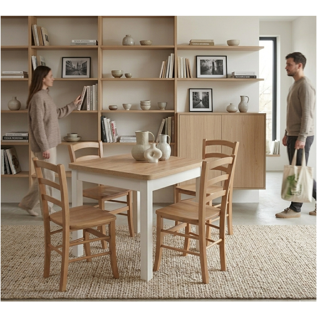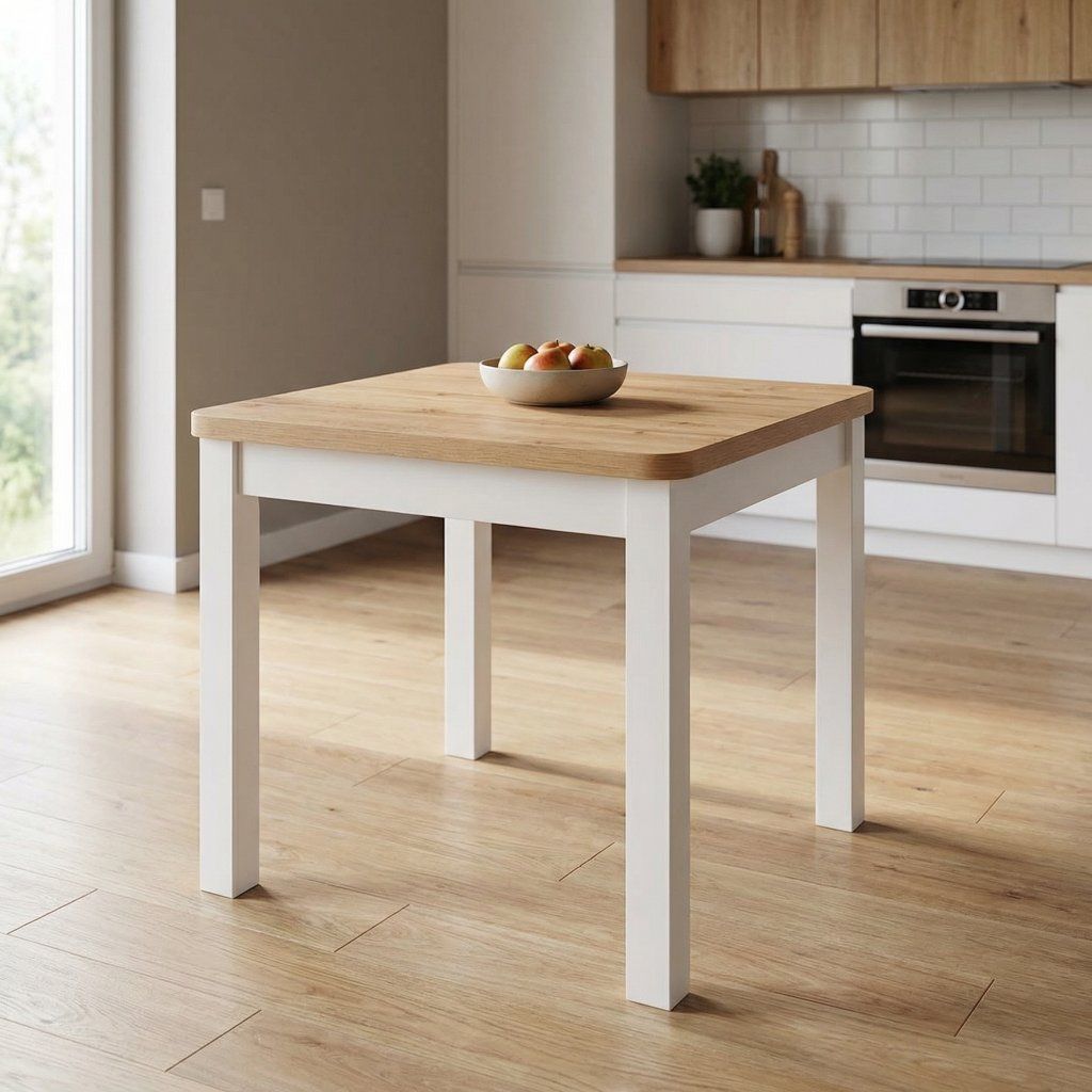 Bukové nohy drží stůl pevně na místě a lamino na horní desce s ABS hranou přežije ranní shon i dětské tvoření. Nemusíte se bát rozlitého čaje ani škrábanců, povrch je odolný a k úklidu vám stačí mokrý hadřík.