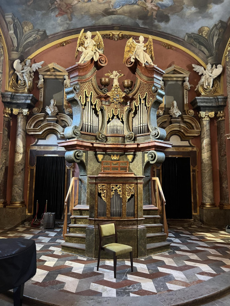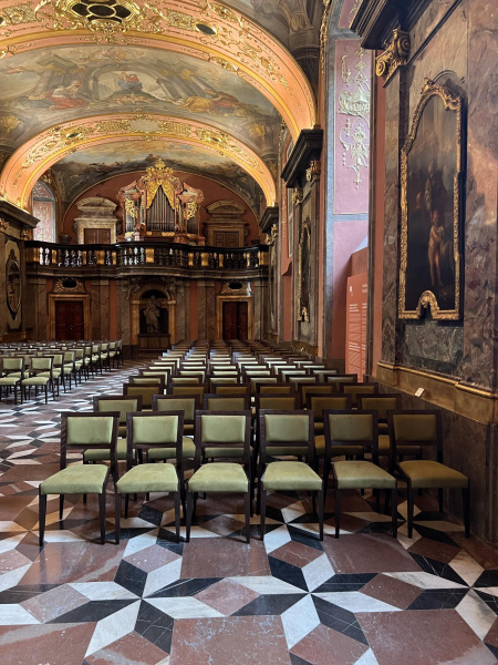 Klementínská kaple, která byla postavena mezi roky 1722 až 1726 a nyní slouží jako místo pro kulturní akce a různé koncerty. V této krásné barokní stavbě nyní najdeme zakázkové židle VIENA 120 v odstínu Noce scuro, což je v překladu tmavě hnědá. Židle má zelenou potahovou látku s funkcí aquaclean.