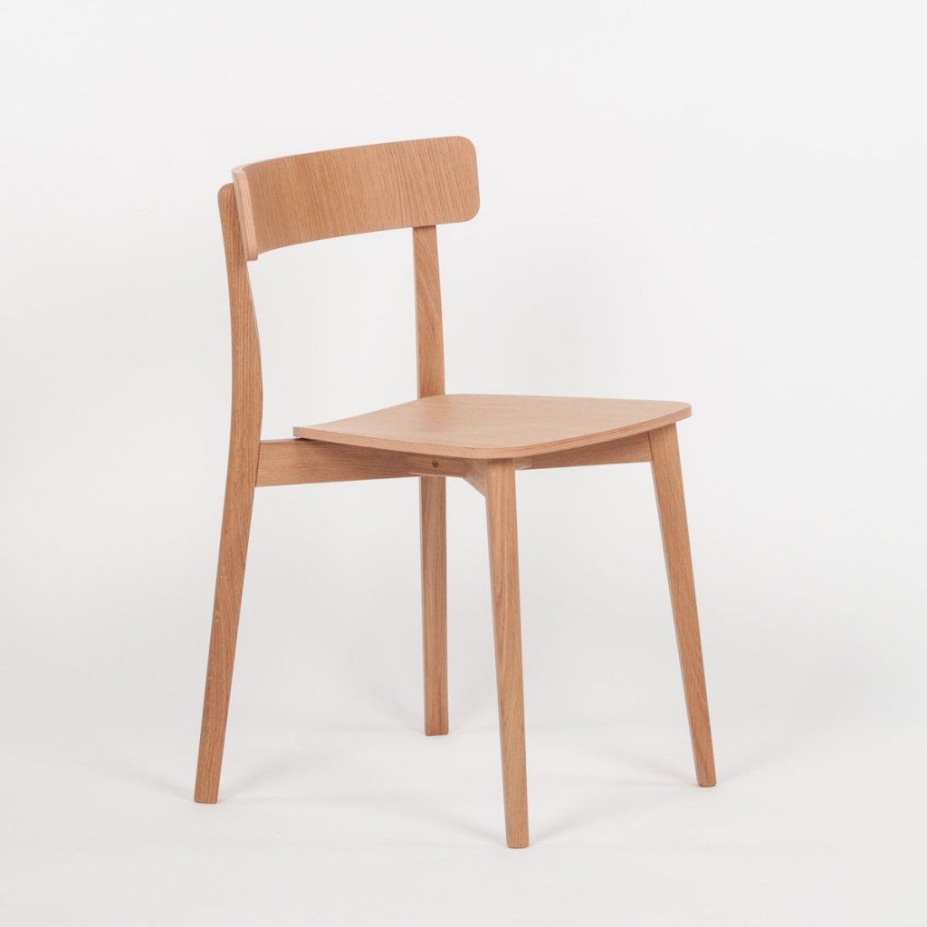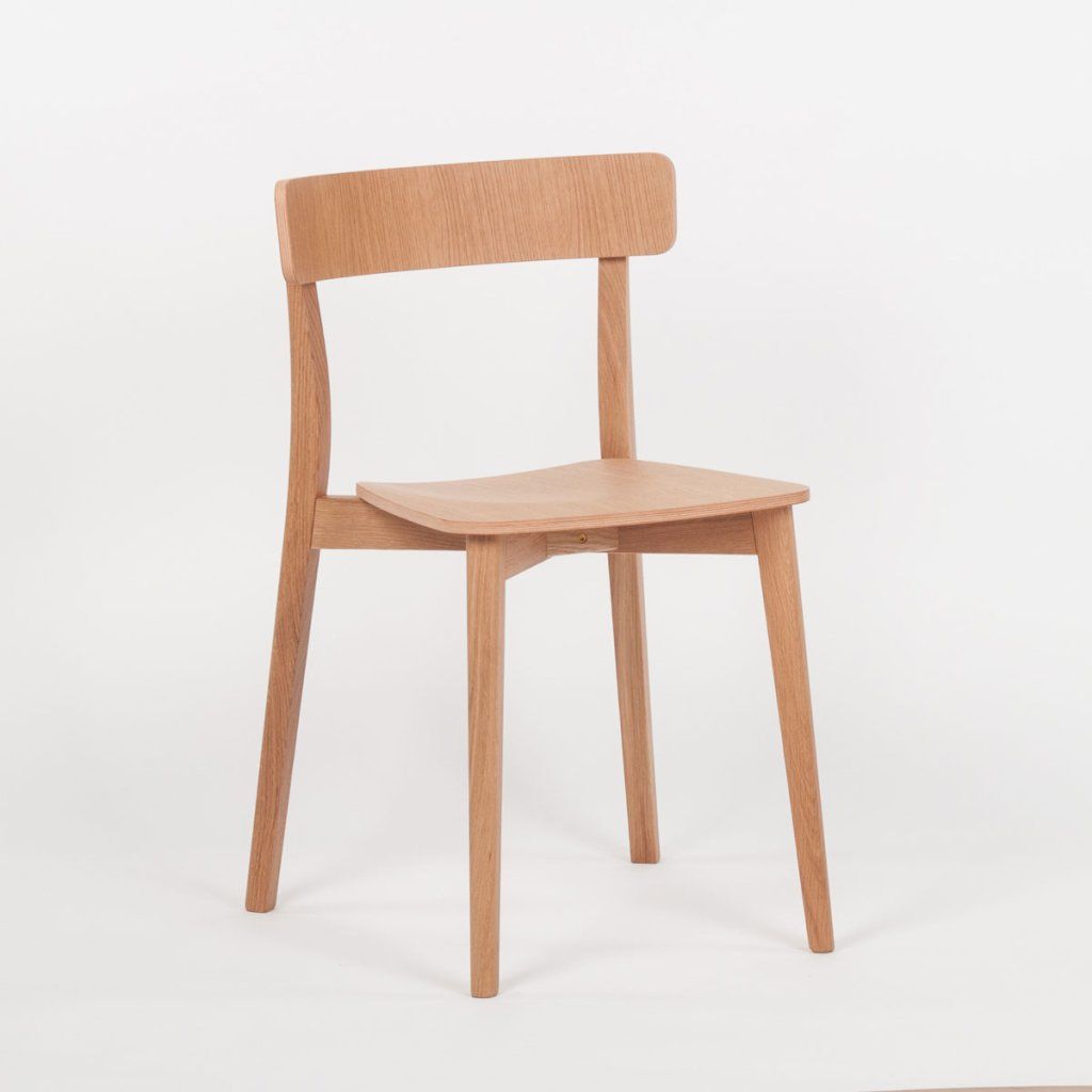 Jídelní židle má světlou dřevěnou konstrukci s jemnou kresbou materiálu. Opěradlo tvoří široký, mírně prohnutý panel uchycený na dvou štíhlých svislých prvcích. Sedák je hladký, s lehce zaoblenými hranami a navazuje na jednoduchý, funkční design. Nohy jsou rovné, jemně zkosené a vytváří stabilní základ. Díky svému neutrálnímu vzhledu se hodí jako jídelní židle do domácnosti, restaurace i kavárny.