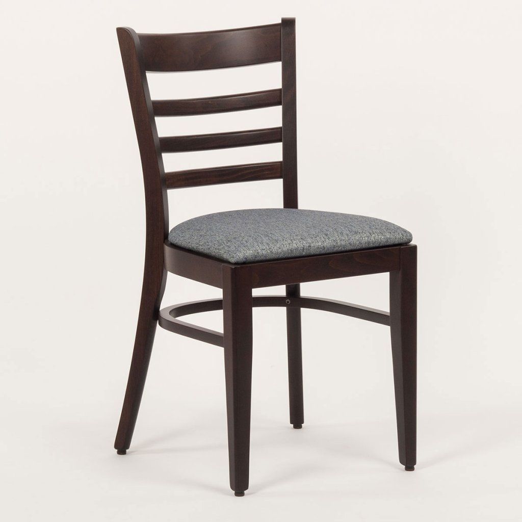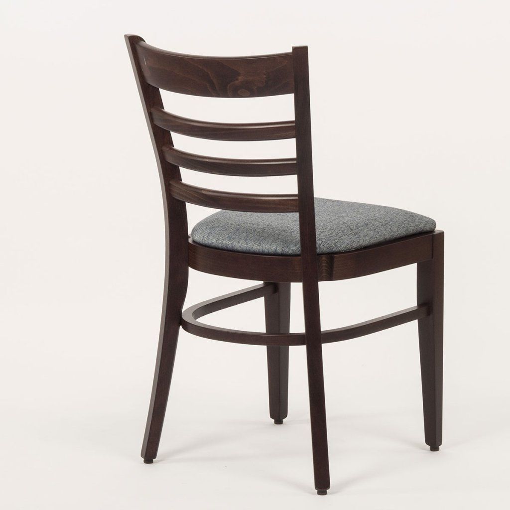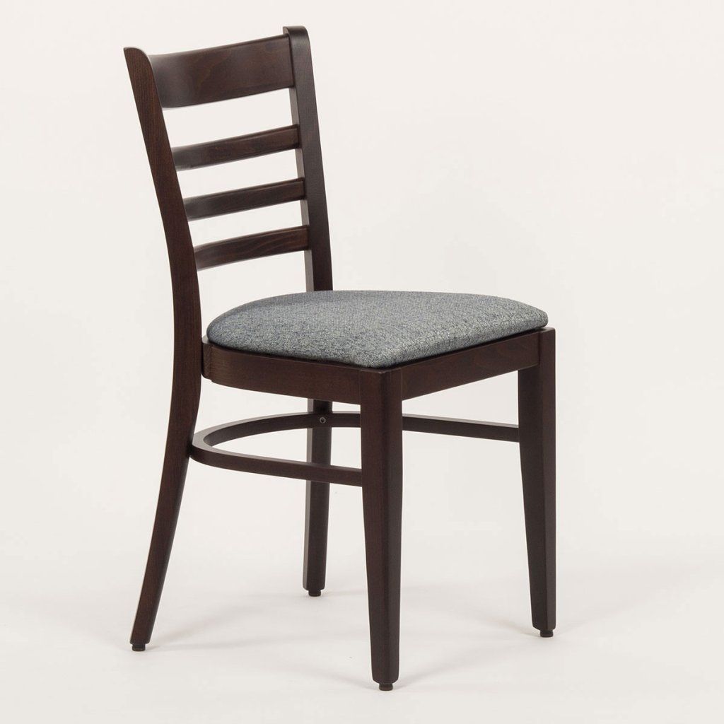 Jídelní židle má tmavou dřevěnou konstrukci s výraznou kresbou materiálu. Opěradlo tvoří několik vodorovných lamel, které jsou mírně prohnuté a poskytují oporu zad. Sedák je čalouněný šedou látkou a má měkčený, pohodlný povrch. Nohy jsou pevné, lehce tvarované a propojené kruhovou výztuhou pro vyšší stabilitu. Díky své konstrukci a komfortu je vhodná jako jídelní židle do restaurací, kaváren i veřejných prostor.