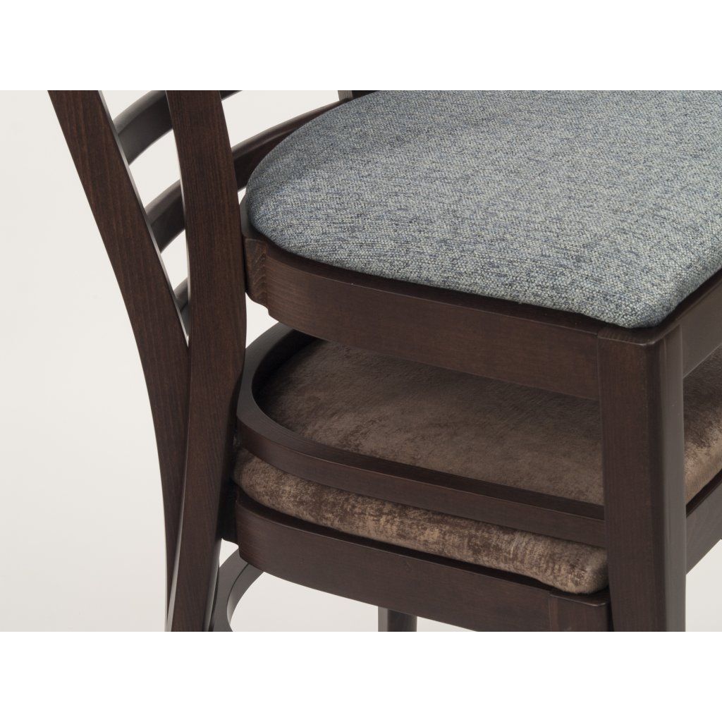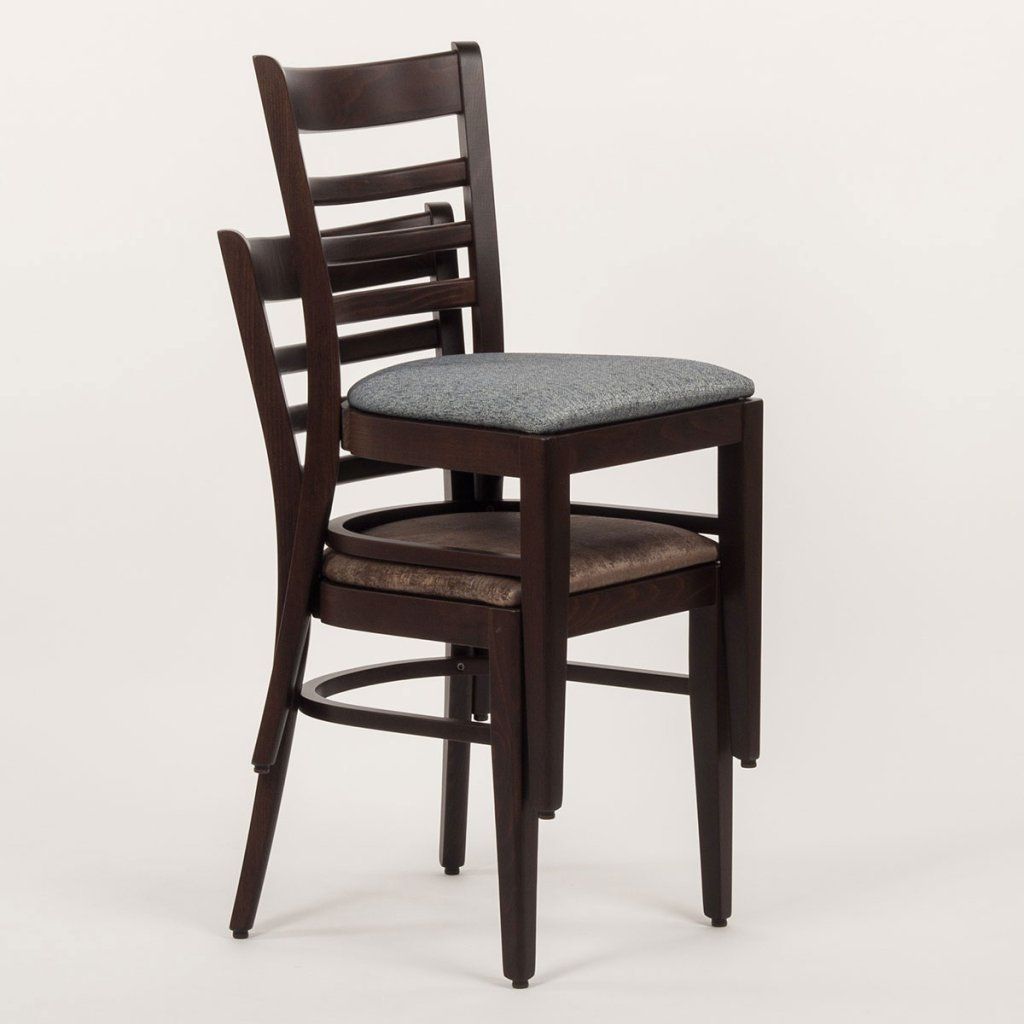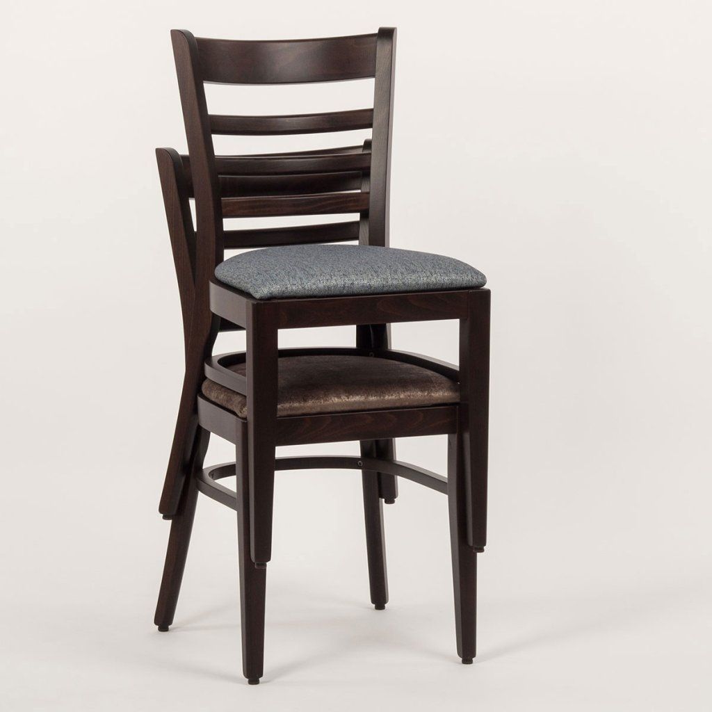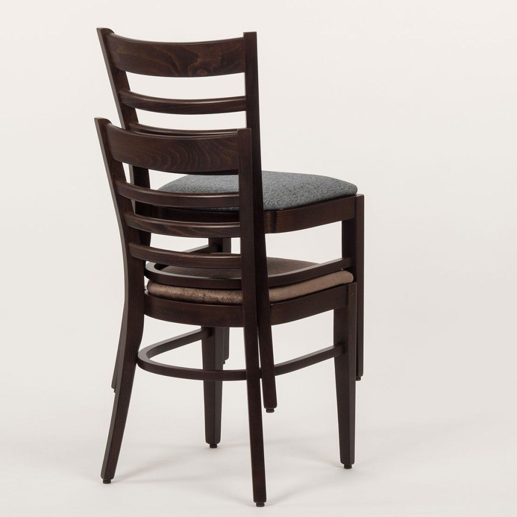 Jídelní židle má tmavou dřevěnou konstrukci s výraznou kresbou materiálu. Opěradlo tvoří několik vodorovných lamel, které jsou mírně prohnuté a poskytují oporu zad. Sedák je čalouněný šedou látkou a má měkčený, pohodlný povrch. Nohy jsou pevné, lehce tvarované a propojené kruhovou výztuhou pro vyšší stabilitu. Díky své konstrukci a komfortu je vhodná jako jídelní židle do restaurací, kaváren i veřejných prostor.