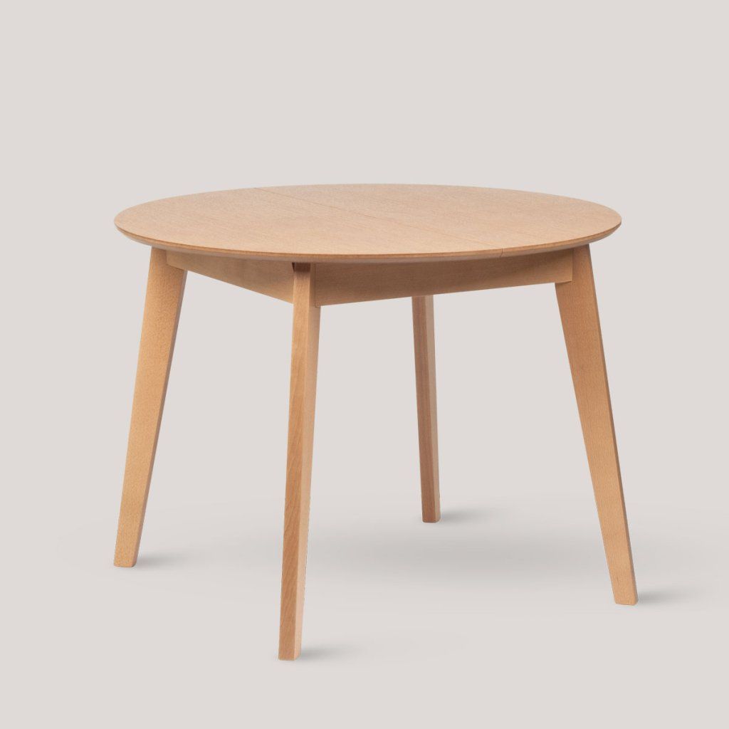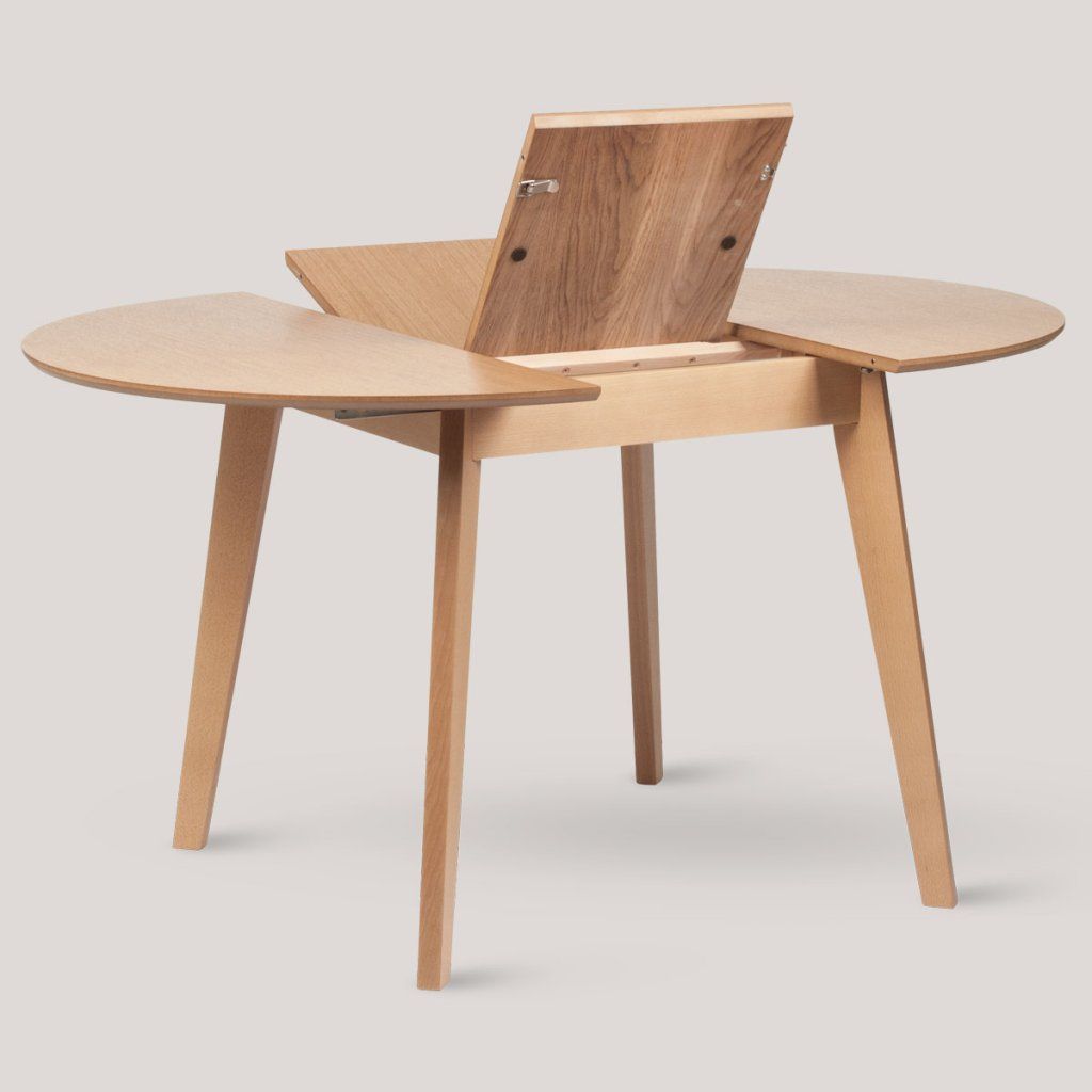 Jídelní stůl zaujme kulatou deskou s hladkým povrchem a jemnou kresbou dubové dýhy. Zaoblený tvar podporuje přirozené sezení a příjemnou atmosféru u stolu. Konstrukci tvoří čtyři mírně šikmé nohy, které zajišťují stabilitu a zároveň odlehčený vzhled. Stůl je vybaven rozkládacím mechanismem se středovým dílem, který umožňuje zvětšení plochy podle potřeby. Využití najde jako jídelní stůl v domácnosti i v kavárně nebo menším provozu.