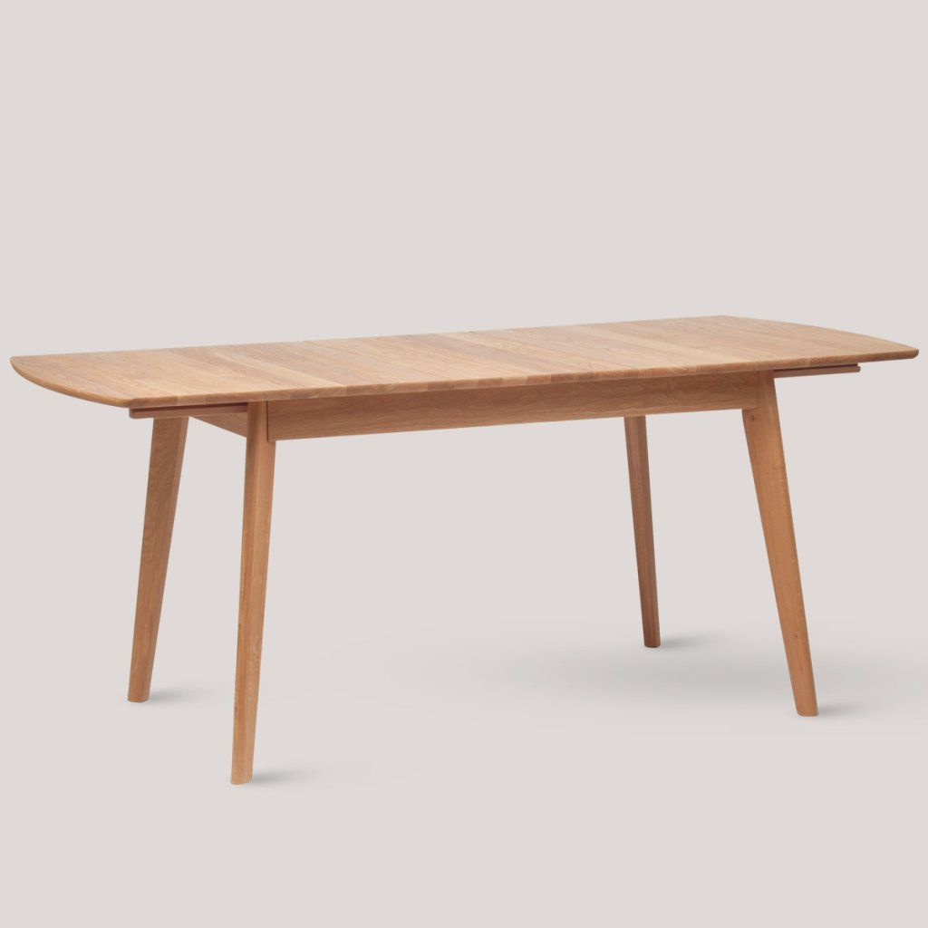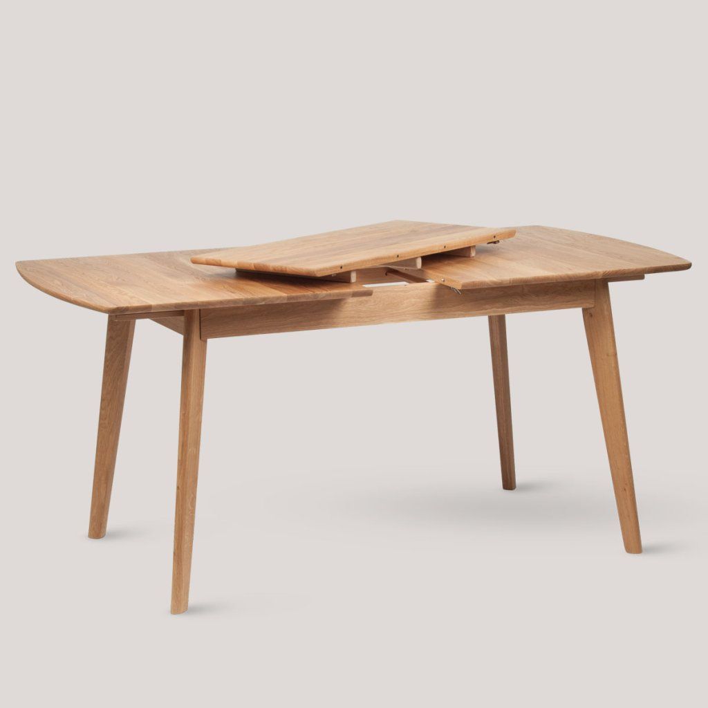 Stůl zaujme obdélníkovou deskou se zaoblenými hranami a výraznou kresbou dřeva, která dodává celku teplý charakter. Konstrukce stojí na čtyřech mírně šikmých nohách, které zajišťují stabilitu a zároveň odlehčený vzhled. Pod deskou je ukrytý rozkládací mechanismus s vloženým dílem, který se jednoduše vysune a rozšíří plochu stolu. Celek působí kompaktně a prakticky bez narušení designu. Jídelní stůl je vhodný do domácnosti.