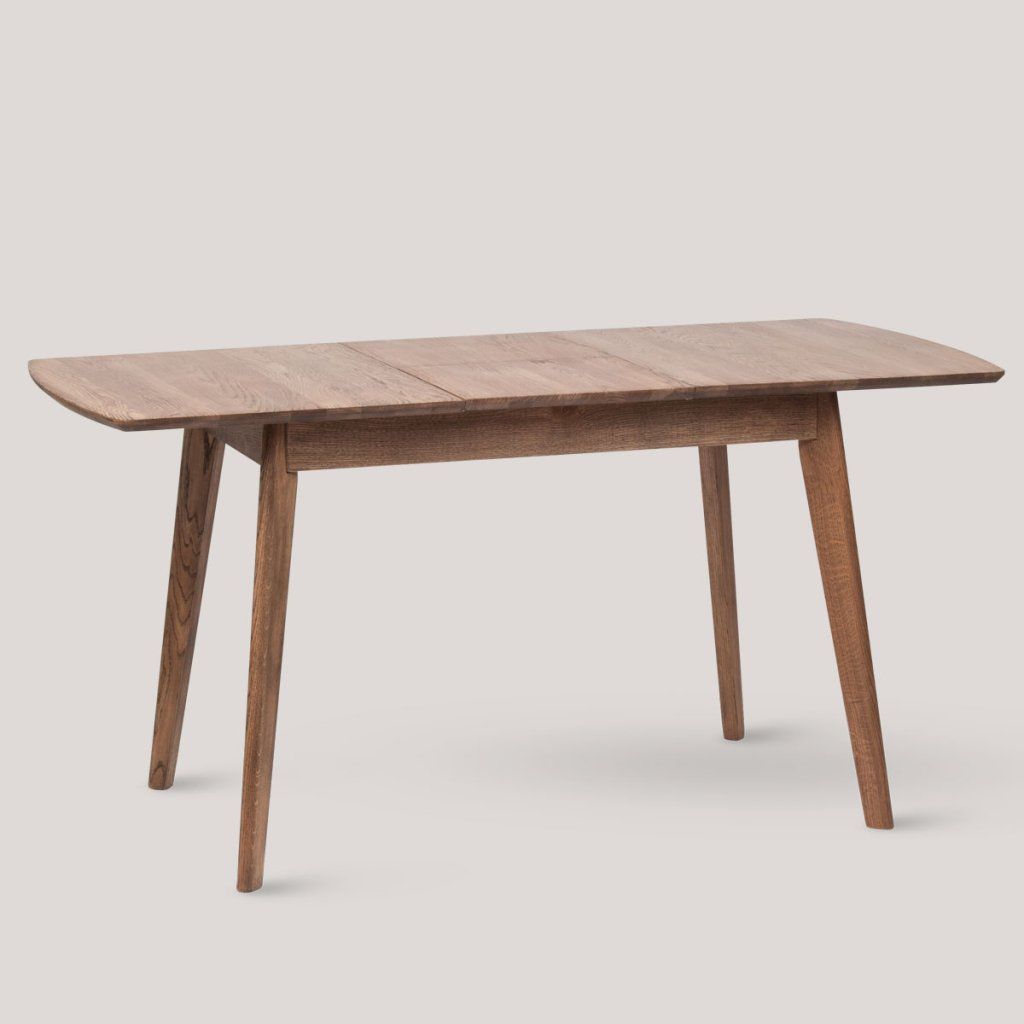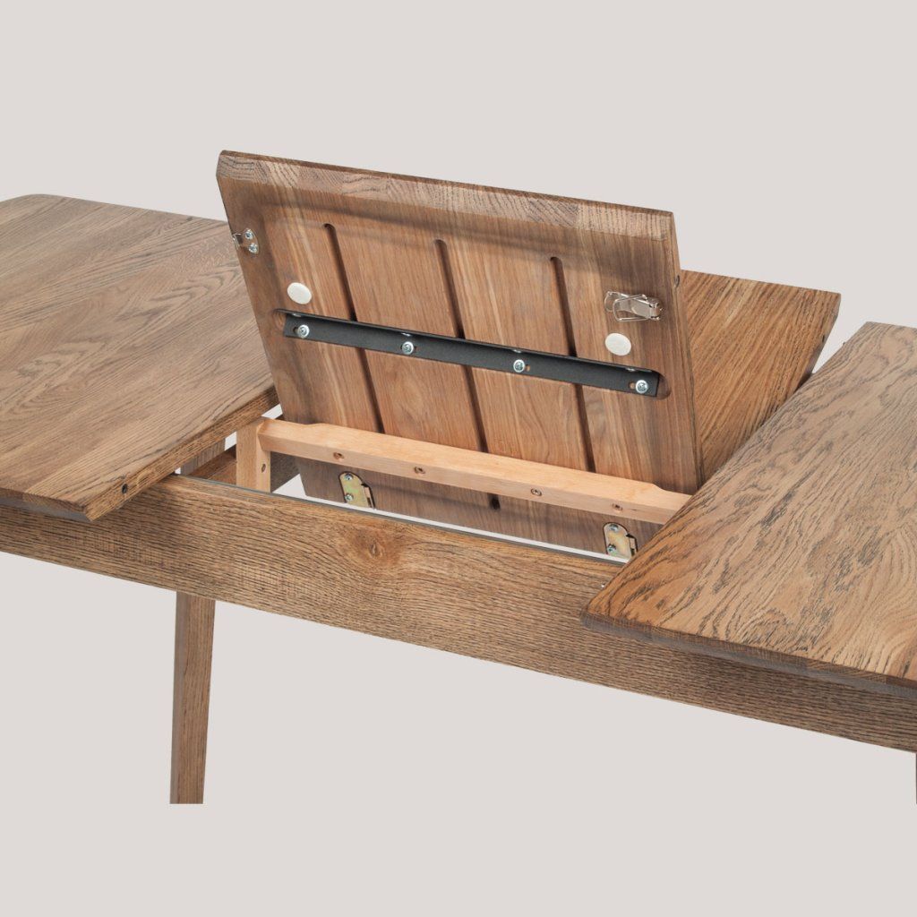 Jídelní stůl zaujme obdélníkovou deskou se zaoblenými rohy a výraznou kresbou dřeva. Povrch působí teple a přirozeně, což snadno zapadne do moderních i klasických interiérů. Stůl stojí na čtyřech mírně zkosených nohách, které zajišťují stabilitu a vzdušný vzhled. Praktickým prvkem je rozkládací mechanismus s vloženou deskou uprostřed, který umožňuje rychlé zvětšení plochy. Využití najde jako jídelní stůl v domácnosti.