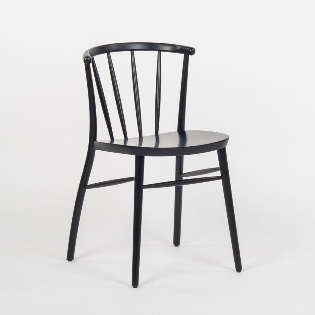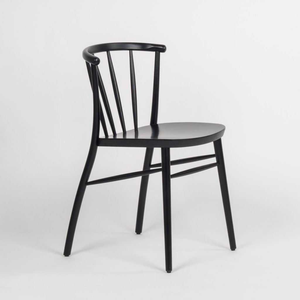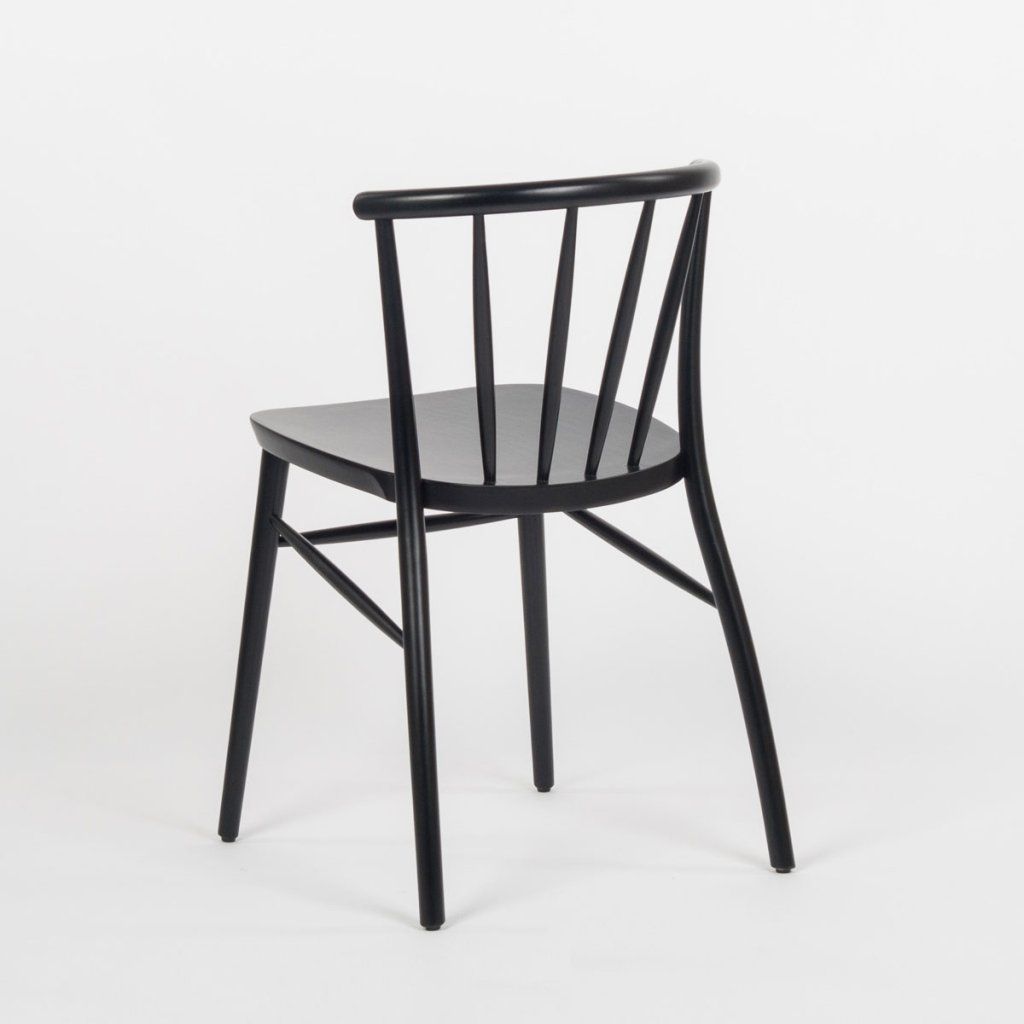 Jídelní židle má černou konstrukci s jemně zaoblenými liniemi a lehkým vzhledem. Opěradlo tvoří několik svislých lamel napojených na horní oblouk, který zajišťuje oporu zad. Sedák je hladký, mírně zaoblený a navazuje na kompaktní tvar celé židle. Nohy jsou štíhlé, lehce rozkročené a propojené příčkami pro vyšší stabilitu. Díky své konstrukci je vhodná jako jídelní židle do restaurací, kaváren i domácnosti.