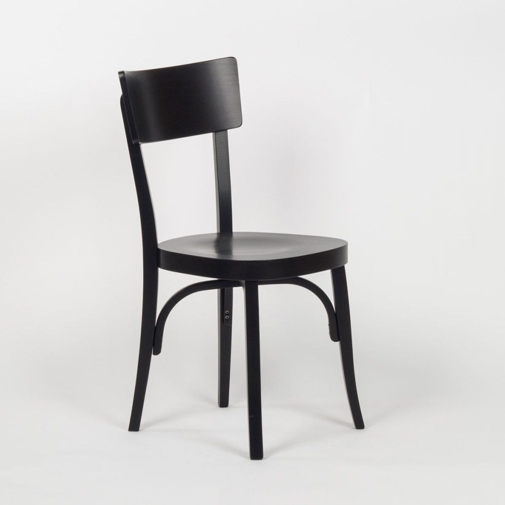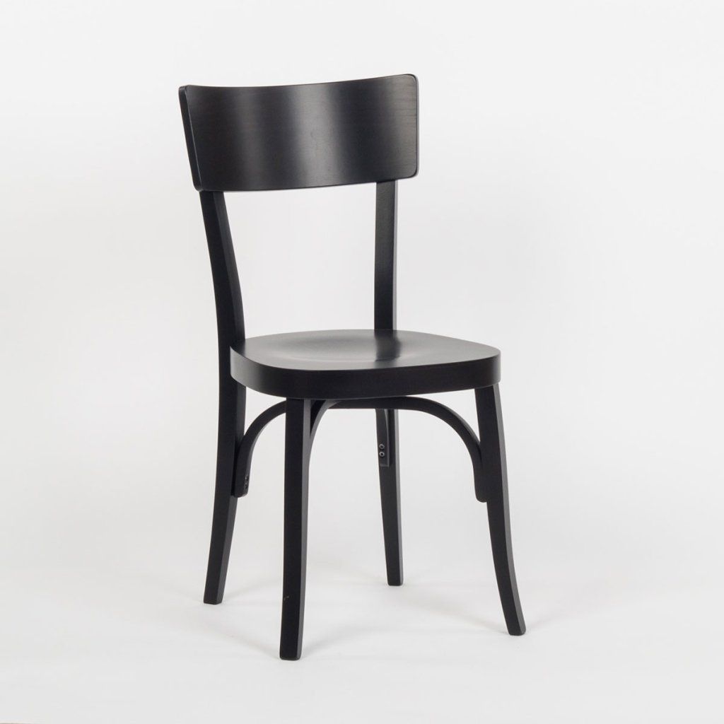 Jídelní židle má černou dřevěnou konstrukci s hladkým, kompaktním vzhledem. Opěradlo tvoří široký, mírně prohnutý panel uchycený na dvou svislých prvcích. Sedák je kulatý, pevný a navazuje na tradiční tvarování celé židle. Pod sedákem jsou obloukové výztuhy, které propojují nohy a zvyšují stabilitu konstrukce. Díky svému provedení je vhodná jako jídelní židle do restaurací, kaváren i dalších gastro prostor.