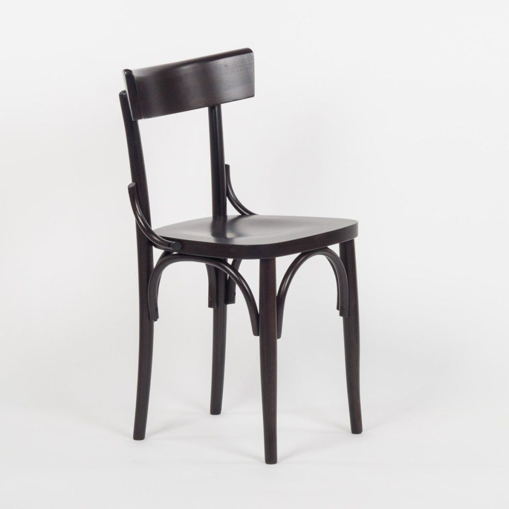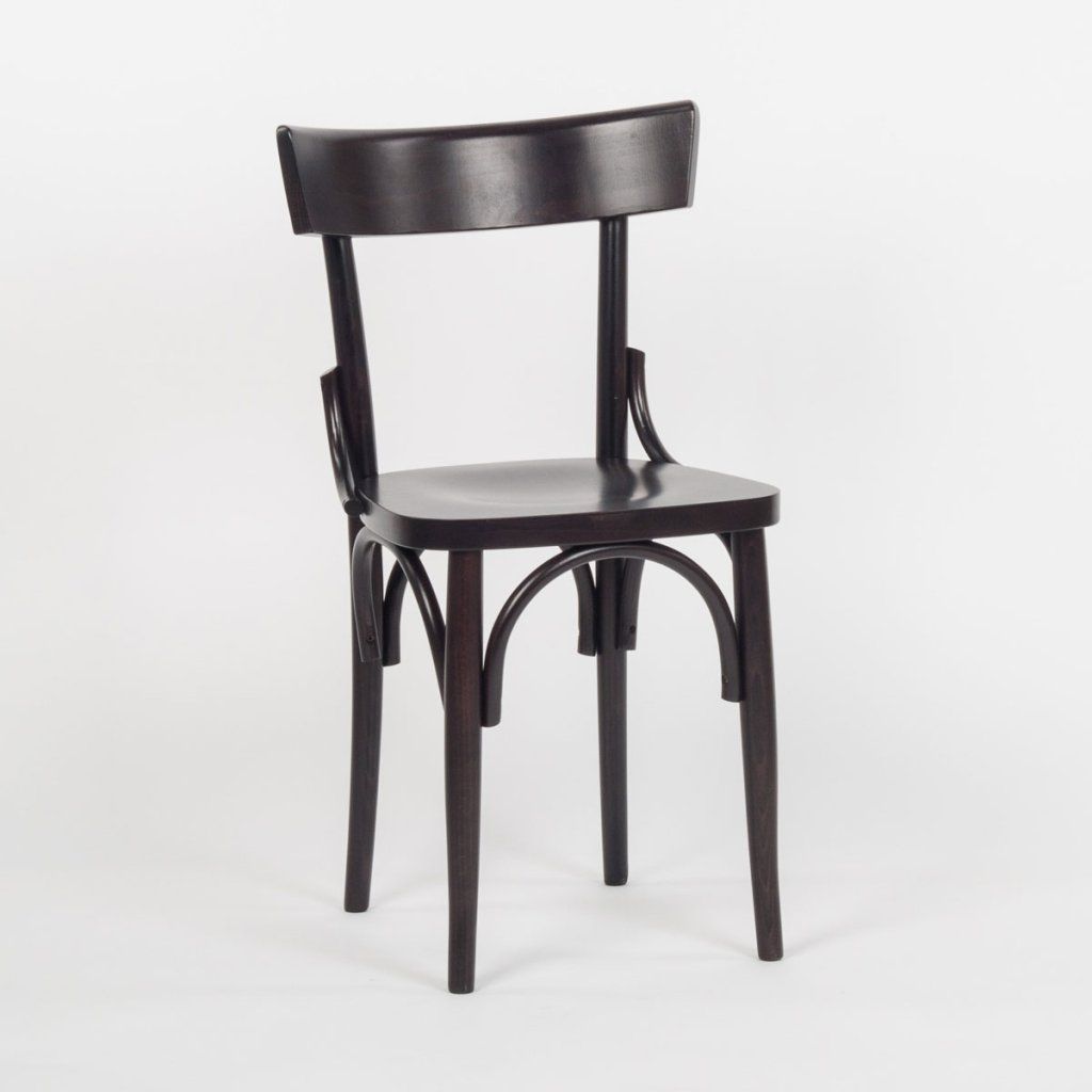 Jídelní židle má tmavou dřevěnou konstrukci s jemně lesklým povrchem. Opěradlo tvoří široký, lehce prohnutý panel uchycený na dvou svislých prvcích. Pod sedákem jsou výrazné obloukové výztuhy, které propojují nohy a zpevňují celou konstrukci. Sedák je hladký, kompaktní a navazuje na tradiční tvarování židle. Díky své konstrukci a stabilitě je vhodná jako jídelní židle do restaurací, kaváren i dalších gastro provozů.