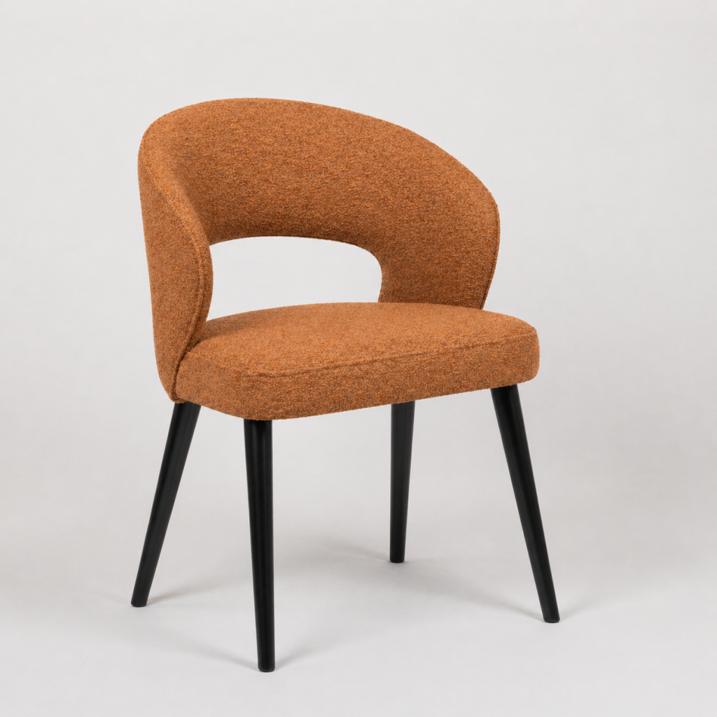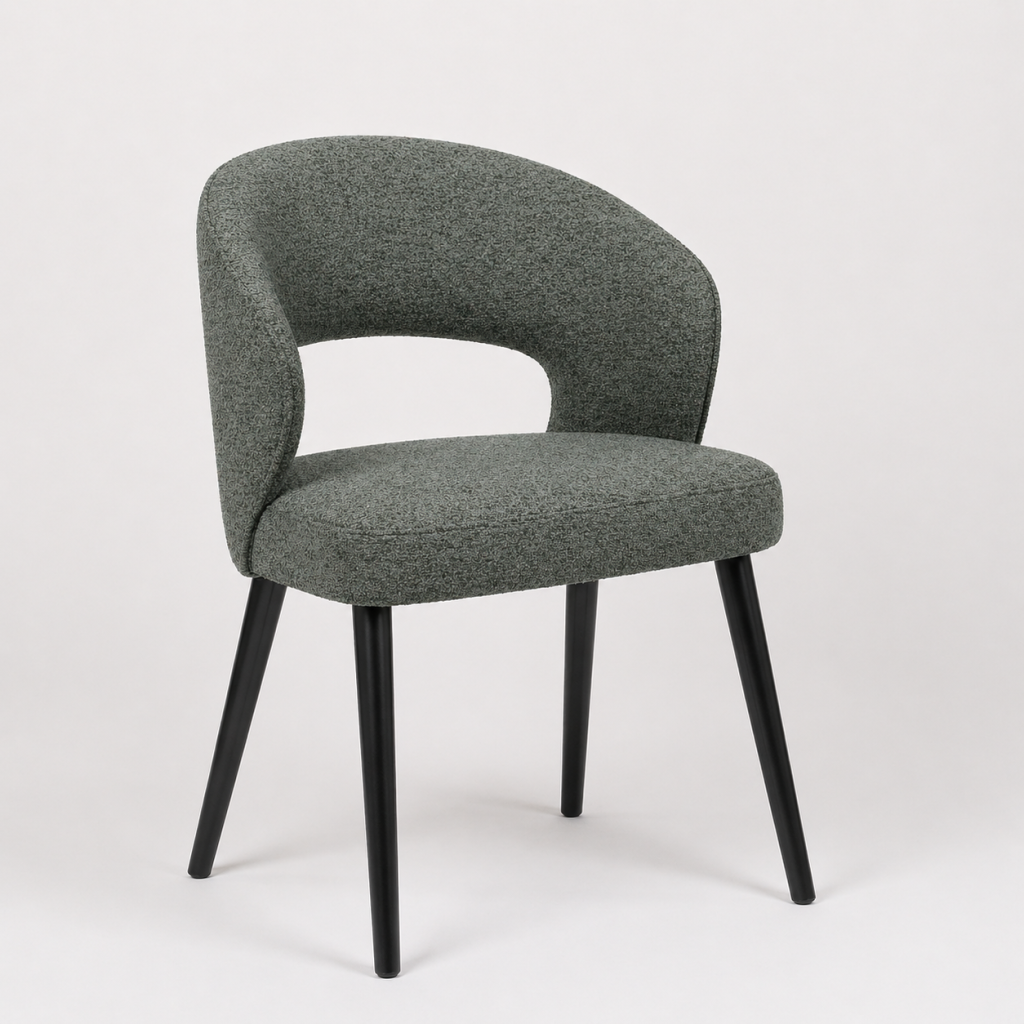 Židle zaujme kompaktním, zaobleným tvarem s plynule navazujícím opěradlem, které přechází do područek. Celá skořepina je čalouněná v jemně strukturované látce, která působí příjemně na pohled i dotek. Sedák je široký a mírně polstrovaný pro komfortní sezení. Konstrukci doplňují štíhlé dřevěné nohy v tmavém mořeném odstínu, které dodávají stabilitu i vizuální kontrast. Ideální jako jídelní židle nebo menší křeslo do domácnosti, kaváren i hotelových prostor.