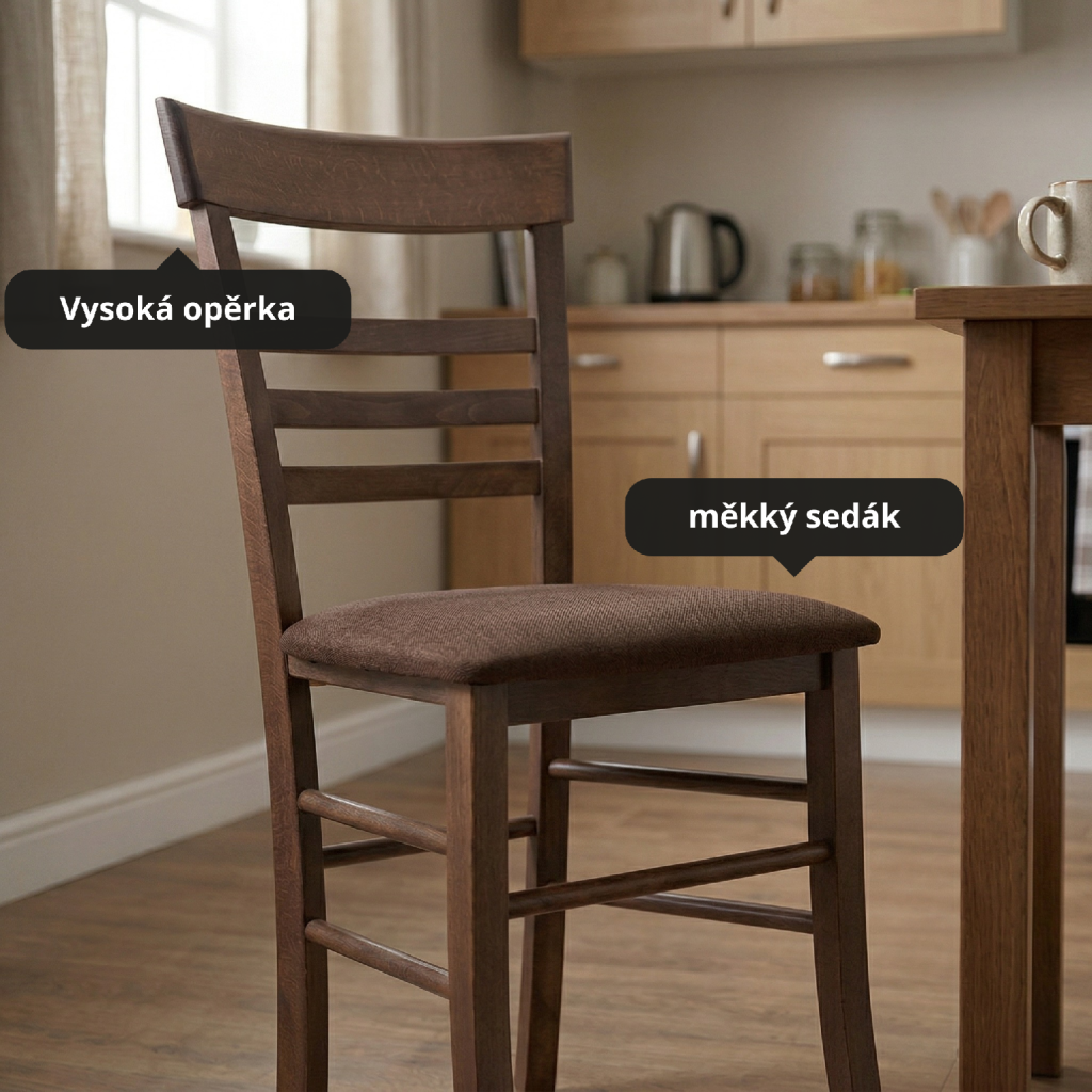Váží jen 5 kg, takže ji odsunete jednou rukou, což oceníte při každém vytírání. Celodřevěné provedení je nejlepší na údržbu, když se něco vylije, prostě to otřete a židle vypadá pořád jako nová. Je to ideální volba do kuchyní, kde se pořád něco děje a kde hledáte nábytek, co přežije roky každodenního používání.
